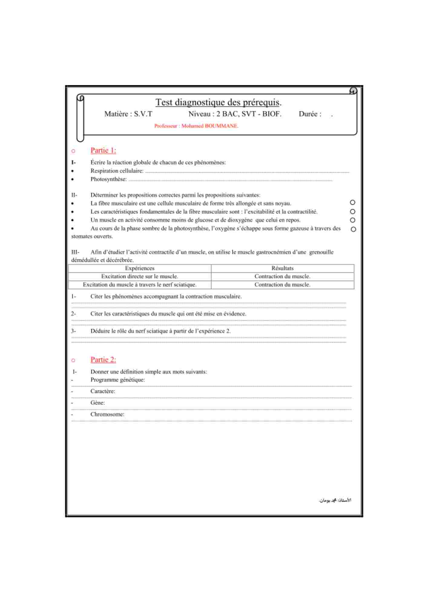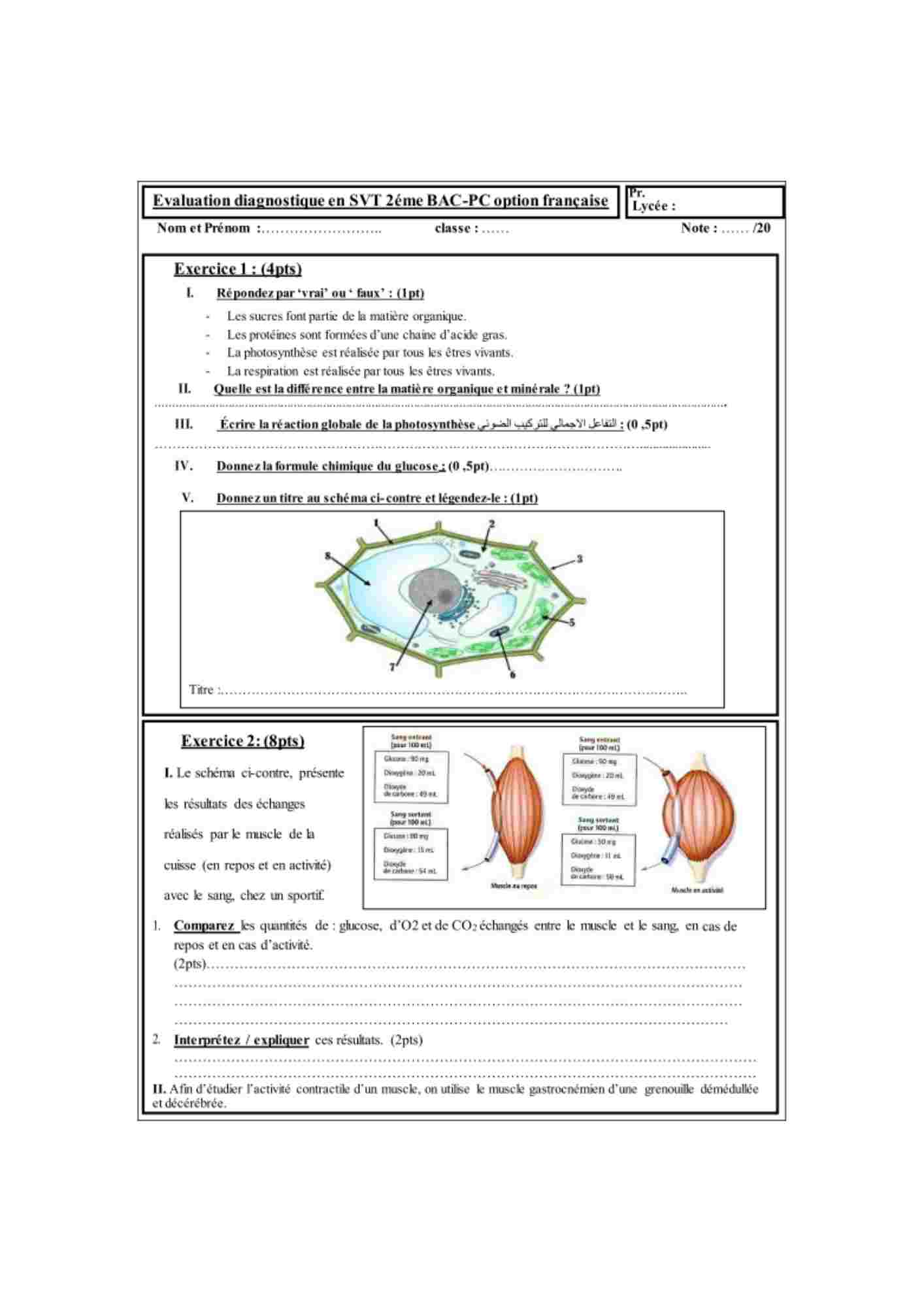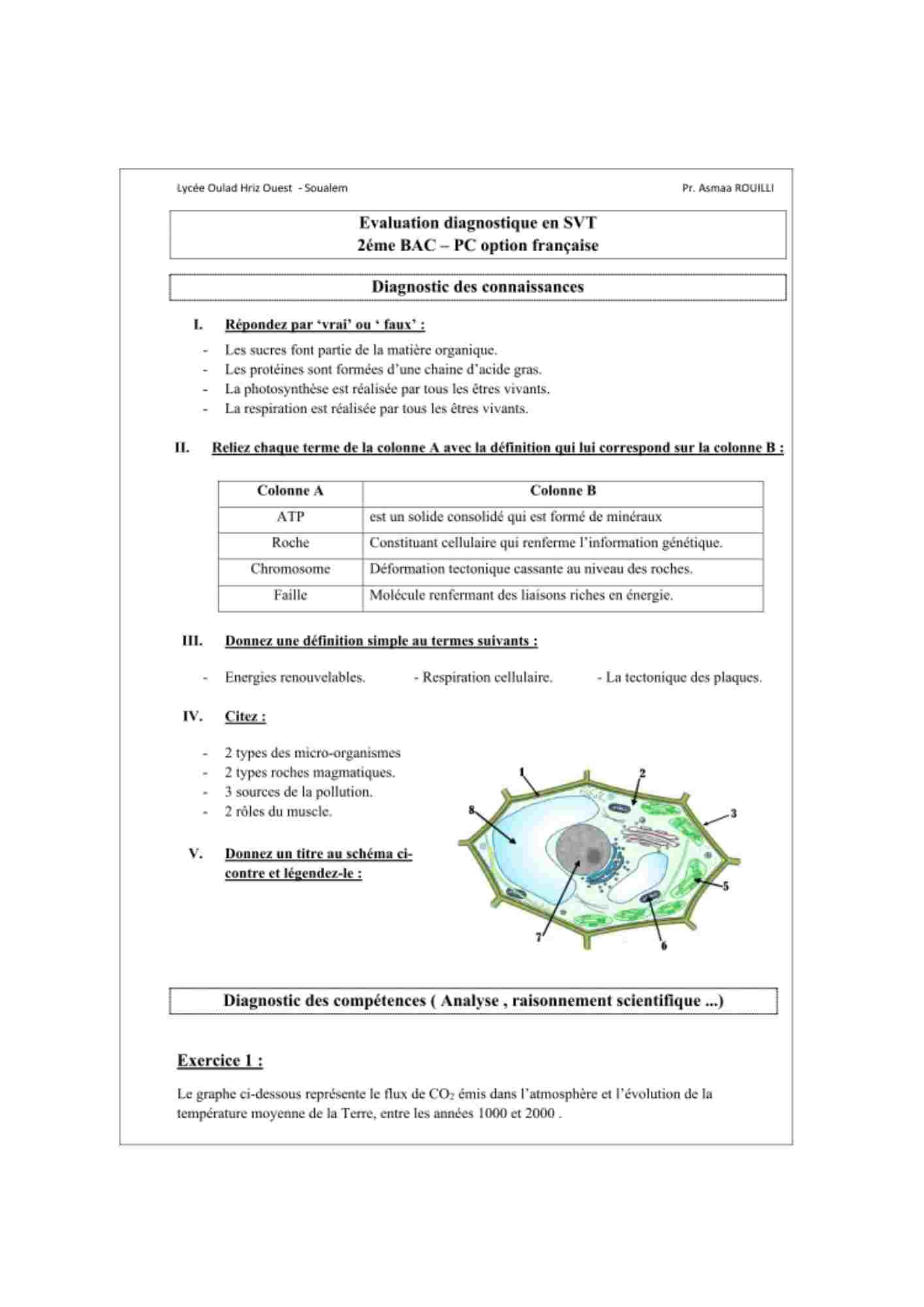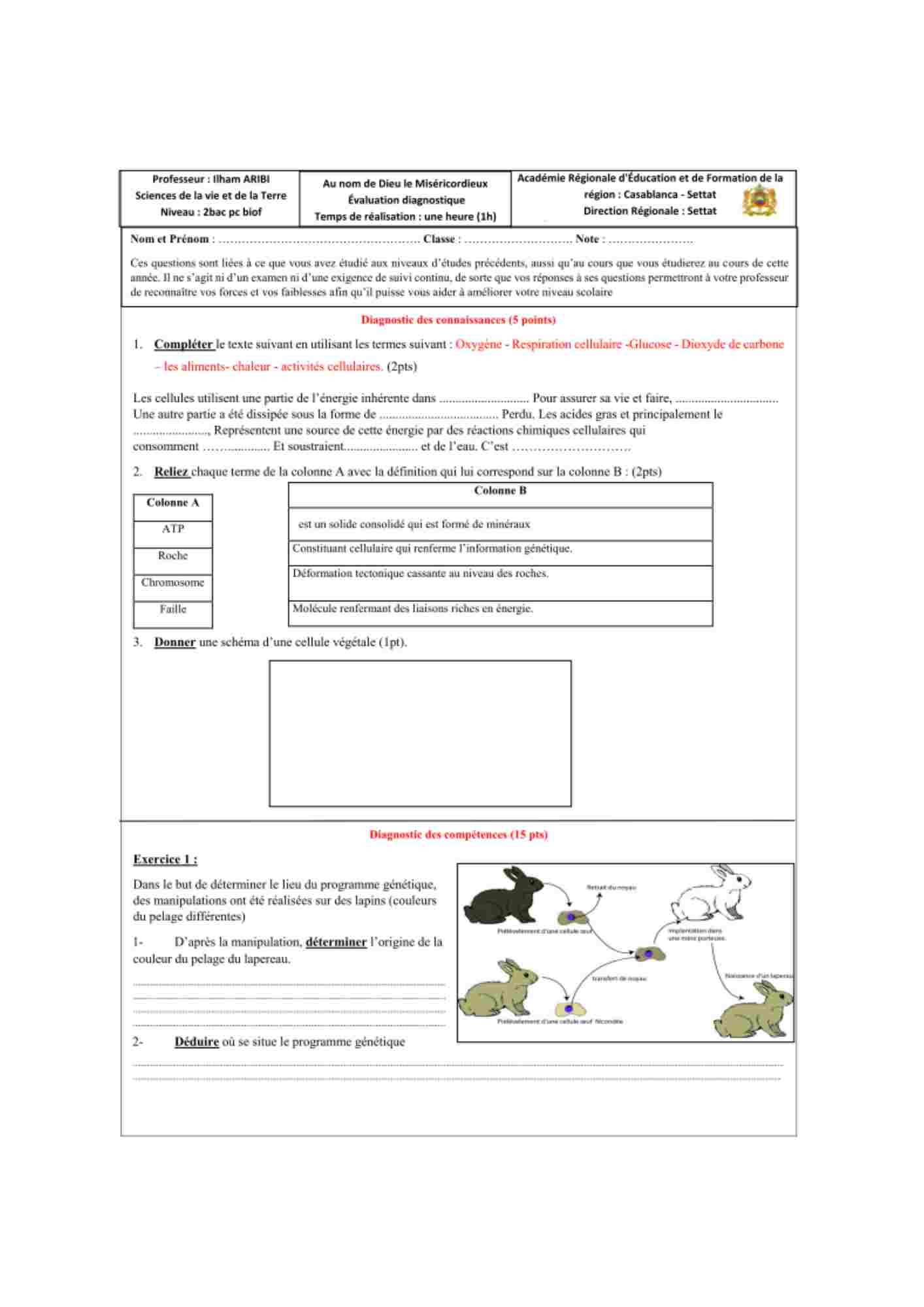 Découvrez un modèle d'évaluation diagnostique en Sciences de la Vie et de la Terre, spécialement conçu pour la 2ème Année Baccalauréat Sciences Physiques.